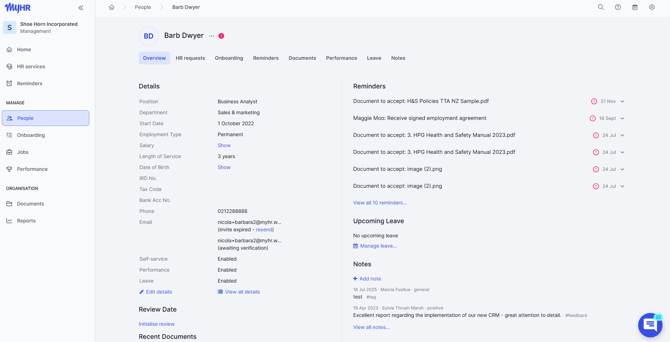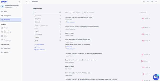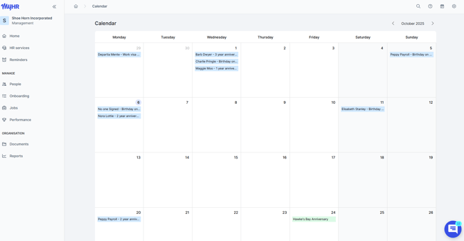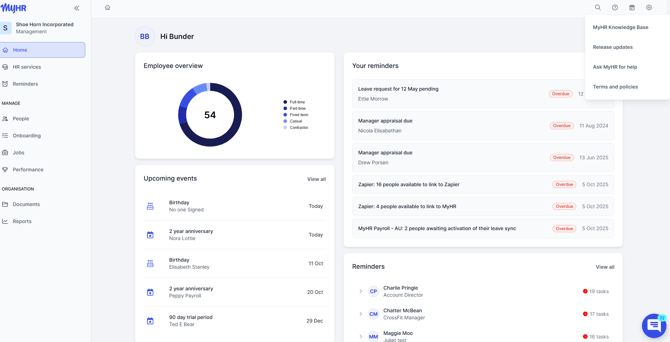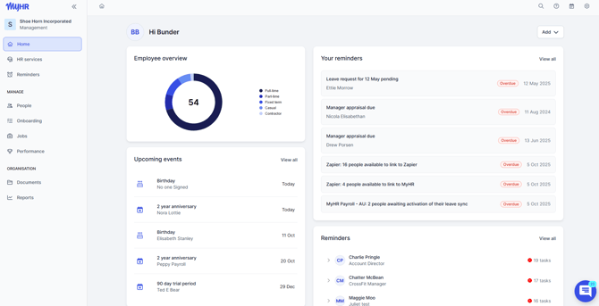 View an employee overview, including your reminders, organisation-wide reminders, and upcoming events.