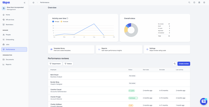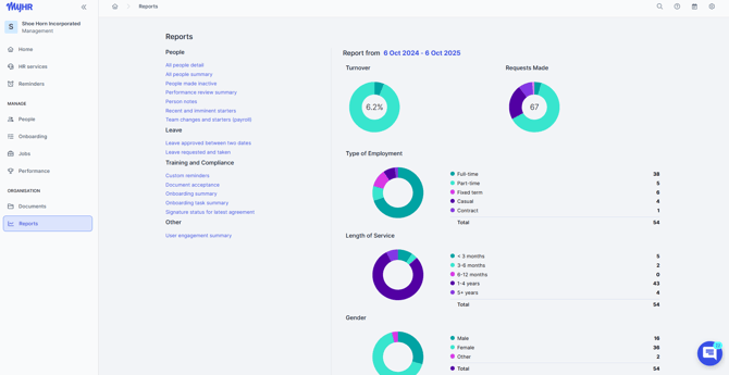 - Generate reports on turnover, employment types, HR services, employee changes, leave, training, and compliance.