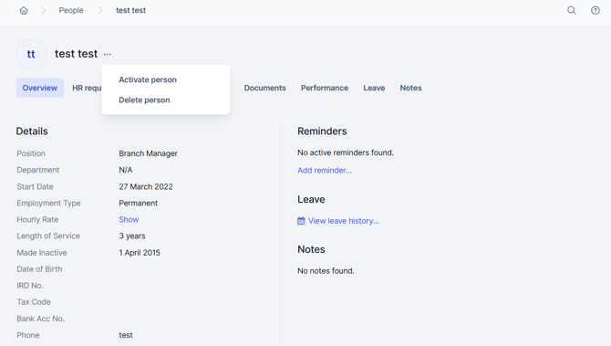 A person's record that has been inactive for 7 years, triggers the delete button to appear on their profile. Again, this is only visible to users of the MyHR account, who have Owner permission or a Manager with department permission and permission to manage people.